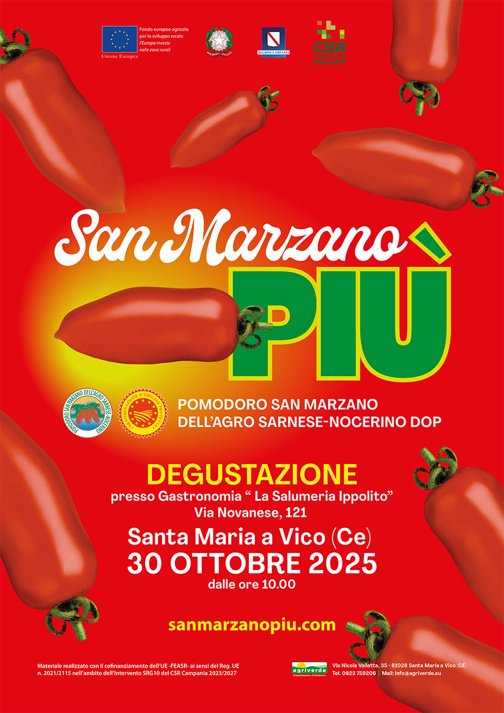 (Agen Food) – Santa Maria a Vico (Ce), 30 ott. – Oggi, giovedì 30 ottobre, a partire dalle ore 10:00, presso la Gastronomia ‘La Salumeria Ippolito’, in Via Novanese 121 a Santa Maria a Vico (Ce) si terrà l’evento inaugurale di una importante Campagna di Valorizzazione del Pomodoro San Marzano dell’Agro Sarnese – Nocerino DOP, promossa dalla O.P. Agriverde e realizzata grazie al sostegno del D.D. Regione Campania n. 406 del 01/07/2024 e ss.mm.ii. – Complemento di programmazione per lo sviluppo rurale Campania – Bando riferito all’intervento SRG10 – Promozione dei prodotti di qualità-Progetto San Marzano più – Misura SRG10 – CRS 2023/2027.