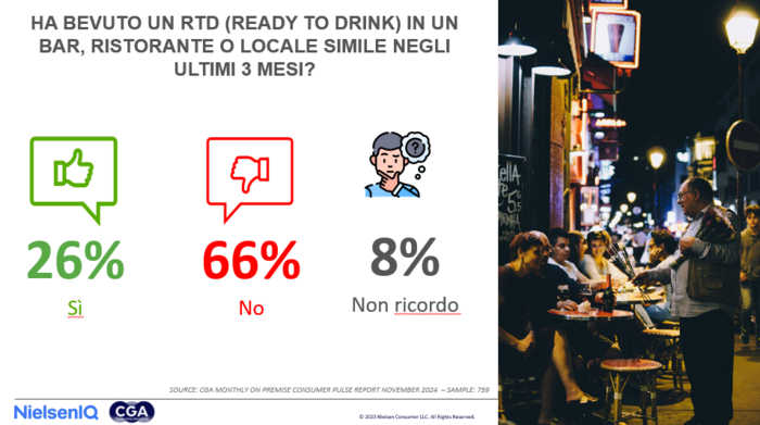 La ricerca aiuta a valutare il comportamento dei consumatori e a identificare le aree di crescita del settore, che a novembre 2024 ha registrato un sostanziale equilibrio vs lo scorso anno con l’84% dei consumatori che ha dichiarato di essere uscito a mangiare e il 55% di essere uscito per un drink. In particolare la ricerca ha analizzato il segmento RTD, sempre più conosciuto e presente nell’Horeca. Infatti, più di un terzo dei consumatori (35%) afferma di aver notato un aumento dei drink pronti da bere negli ultimi 12 mesi, mentre solo il 3% ha registrato una diminuzione.