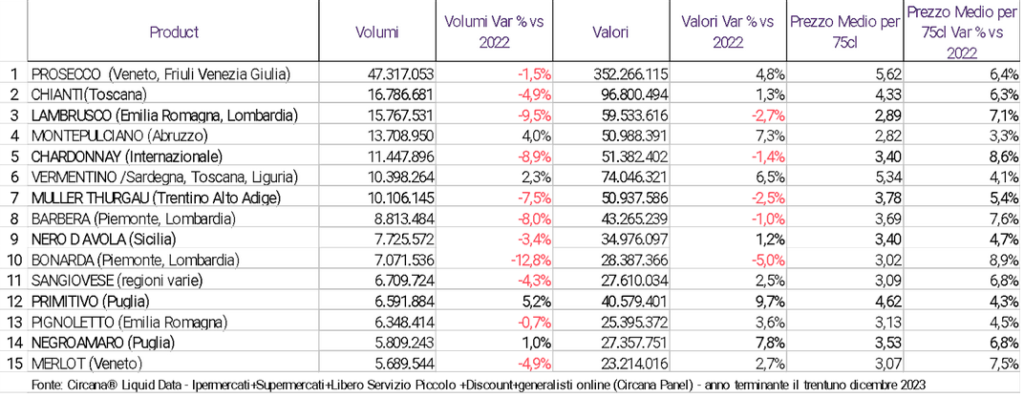 (Agen Food) – Verona, 26 mar. – 756 milioni di litri di vino e spumante venduti nel 2023 nella Grande Distribuzione ne fanno il canale commerciale più ampio. Quali sono i vini più acquistati dagli italiani in supermercati e discount nell’anno passato? Prosecco (spumante e vino frizzante) con oltre 43 milioni di litri, -1,5% sull’anno precedente; Chianti con più di 16 milioni di litri, – 4,9%; Lambrusco con oltre 15 milioni di litri, -9,5%; Montepulciano d’Abruzzo con più di 13 milioni di litri, +4%; Vermentino con oltre 10 milioni di litri, +2,3%.