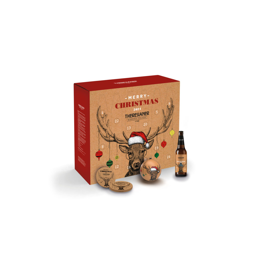 Calendario dell’Avvento Theresianer: torna nel 2021 il “gioco dell’attesa”, le magiche 24 caselle che scandiscono il countdown del mese di dicembre e lo trasformano in un divertimento quotidiano. Si procede di finestra in finestra per scoprire piccoli cadeaux a tema oltre a tutte le birre Theresianer in formato 0,33 l. Il percorso gustativo finisce con una birra sorpresa in edizione speciale! La scatola abbina il tradizionale rosso all’effetto naturale del packaging, su cui cappeggia la renna Theresianer.