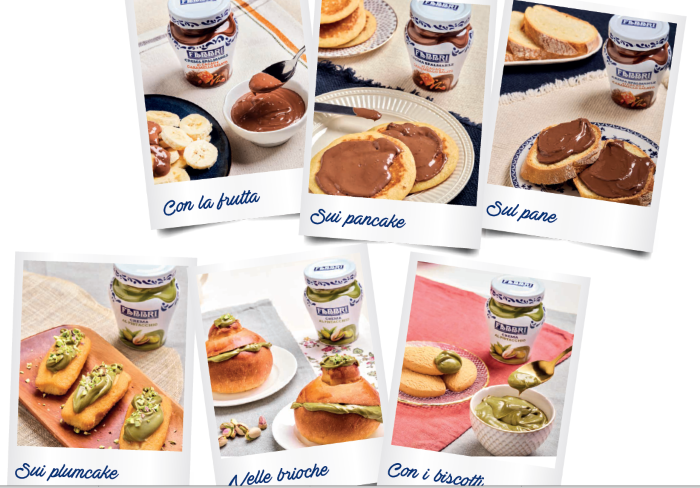 In ogni momento della giornata le creme spalmabili Fabbri trovano un loro perché: accompagnano dalla colazione del mattino – farcendo un croissant o arricchendo una fetta biscottata – alla merenda; sono ottime spalmate su un pezzo di pane, ma diventeranno insostituibili per una gratificazione dopo cena, dove, immaginiamo, si romperanno gli schemi, assaporandole direttamente dal vasetto con un cucchiaino.