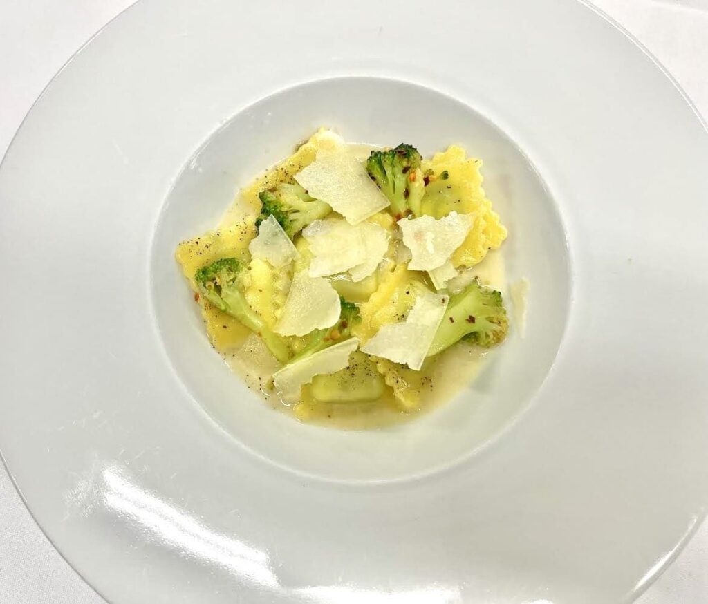 La presentazione del piatto, con l’emulsione di Pecorino sul fondo, i ravioli disposti con cura e i broccoli come guarnizione, offrono inoltre una piacevole esperienza visiva oltre che gastronomica.