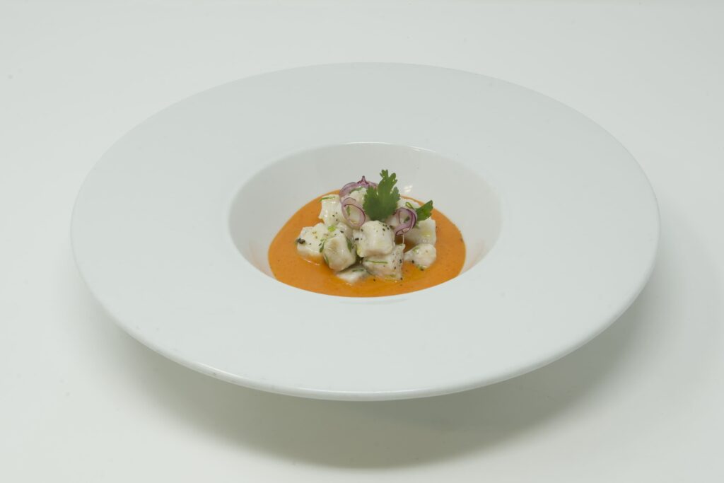 5° Classificato: Ceviche di pesce bianco – con cipolla rossa, limone e coriandolo, su coulis di peperoni dolci