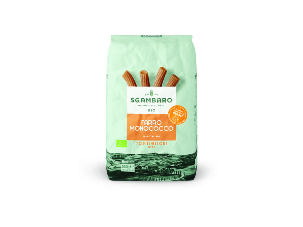 La linea Farro Monococco, che comprende i formati fusilli, tortiglioni e penne rigate, è ricca di antiossidanti, carotenoidi, vitamine e minerali, ha un basso contenuto in glutine, di grassi e contiene amido in forma altamente solubile.