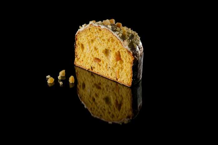 Il Panettone alla Melannurca Campana Igp di Anima Dolce è realizzato dai pastry chef Francesco e Gianluigi Franzese con impasto aromatizzato e arricchito con Melannurca Campana IGP semi candita, farcito con crema pasticcera e glassato al cioccolato bianco.