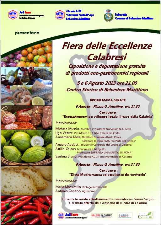 Sabato 5 alle ore 21.30 avrà luogo il convegno dal titolo “Enogastronomia e sviluppo locale: il caso della Calabria”, dove interverranno Michele Muscio, membro della Presidenza Nazionale ACLI Terra, Ugo Vetere, CDA GAL Riviera dei Cedri, Annamaria Mele, Direttore generale ANAPI Pesca e Direttore Tecnico FLAG “La Perla del Tirreno”, Angelo Adduci, Presidente Consorzio del Cedro di Calabria, Attilio Celant, economista e geografo, professore dell’Università La Sapienza di Roma e Santina Bruno, Presidente ACLI Terra Provinciale di Cosenza.