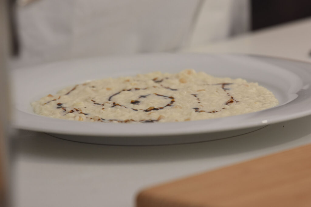 Lo chef Marchini ha preparato per l’occasione un risotto che rende omaggio alla tradizione culinaria del territorio modenese attraverso l’utilizzo di due eccellenze gastronomiche. Riso con infuso di latte al Parmigiano Reggiano dalle note dolci, e le sue croste dal sapore intenso e dalla diversa consistenza, con un tocco di Aceto Balsamico di Modena dop per dare acidità al piatto.