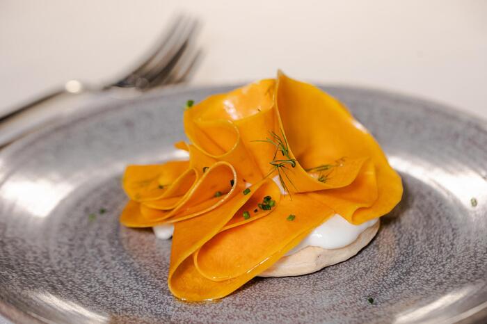 Una brisè dorata e friabile, fragrante al morso e dal profumo di burro appena sfornato, accoglie un vellutato stracchino montato con panna, soffice come una nuvola e impreziosito dai sentori freschi e aromatici di erba cipollina e timo. Sopra, come un velo autunnale, si adagiano sottili petali di zucca violina marinata in una delicata emulsione di olio extravergine d’oliva, soia, miso e aceto, che sprigiona un irresistibile equilibrio tra dolcezza vellutata e note sapide e umami.