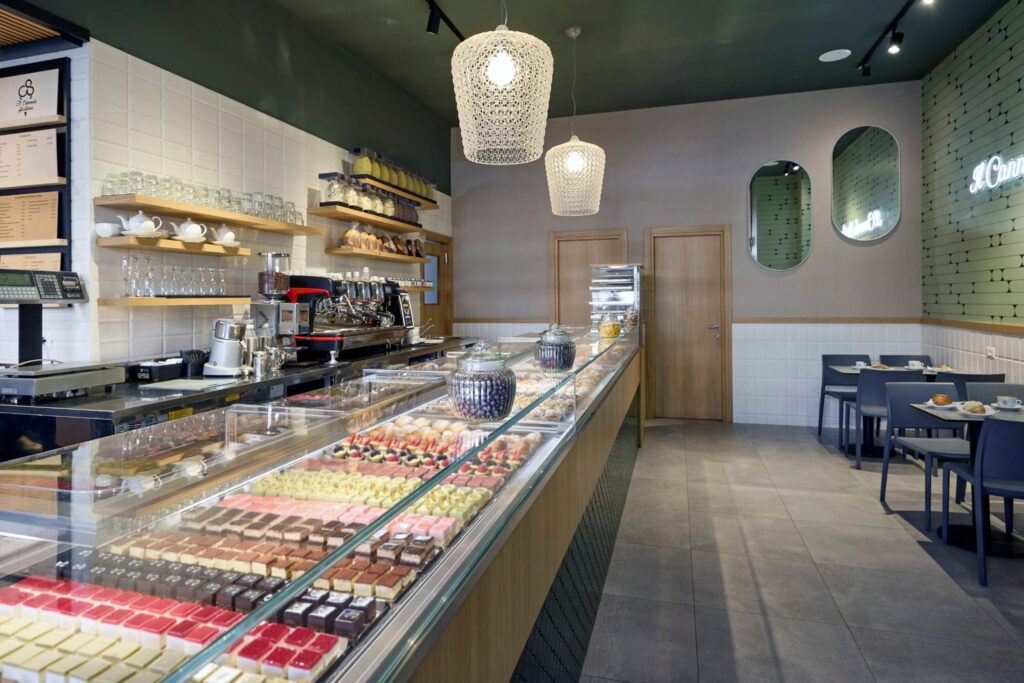 Altri 6 metri sono dedicati al bancone della caffetteria, dove spiccano i lievitati per le colazioni con 20 tipologie di cornetti, vegani, alla vaniglia, integrali al miele, croissant, pain au chocolat, cornetto roll con cremino alla gianduia, trecce con le fragole e ai frutti di bosco, mattonelline con mele e cannella.