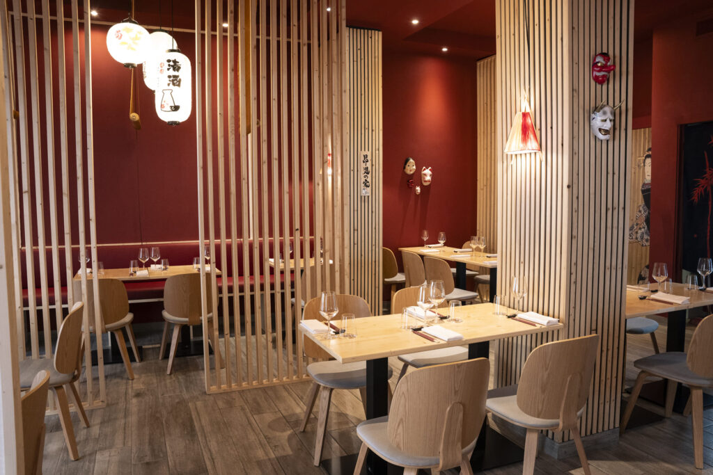 “Proprio per l’importanza della chiave intimista che richiedeva questo progetto ho scelto un taglio cinematografico che mantenesse intatta l’anima ricercata – spiega Valeria Vecellio -. Prendendo ispirazione dai tipici izakaya e dalle caratteristiche architettoniche degli interni giapponesi, abbiamo scelto di ricreare una scatola, quasi appunto una scenografia di interni che accoglie il cliente in un rosso vivo colorblock mitigato dalla verticalità degli inserti in legno naturale a scandire zone ed esperienze e dalle luci calde delle lanterne giapponesi. Il taglio scenografico è amplificato dai numerosi elementi decorativi giapponesi recuperati da uno dei proprietari tra Tokyo, Osaka e Kyoto”.