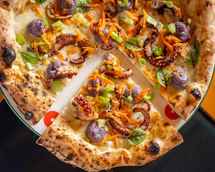 Raffinata la Montanara al gambero rosso,gambero crudo, zucchine marinate, gel di bisque, maionese al lime e pepe rosa. Per le pizze c’è la Tonno e Cipolla in doppia cottura con tataki di tonno rosso, cipolla rossa di Tropea in agrodolce, coulis di basilico, fior di latte, pinoli tostati, oppure la Marinero, pizza croccante con pomodorino corbarino in acqua di mare, alici di Cetara, crema di aglio nero di Voghiera dop, origano e basilico o la Diavola di Mare, polpo alla diavola con pomodorini datterini, prezzemolo, fili di peperoncino e olio EVO.