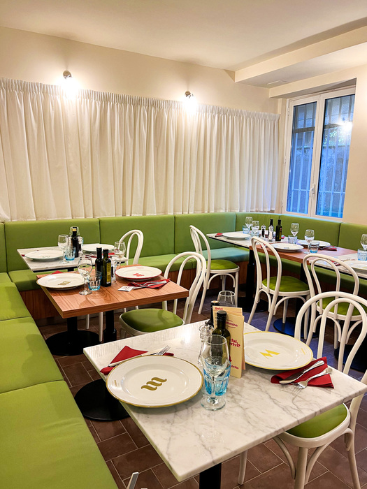 Al piano terra vi sono una serie di tavoli da 2 e 4 persone, di cui alcuni interamente in legno per dare un tocco di stile vintage ed altri con top in marmo di Carrara bianco o in formica colorata rossa/verde. Le sedute alternano panche in legno di noce con rivestimento lavabile in tessuto rigato rosso e panna a iconiche sedie Thonet interamente in legno o con seduta imbottita verde o arancione.