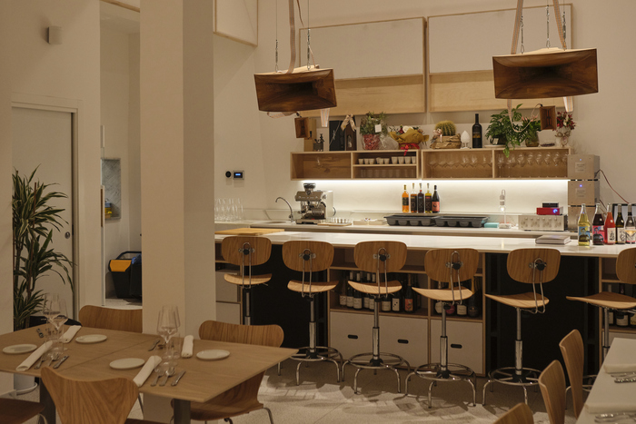 La palette gioca sui toni del bianco e del legno naturale, con linee pulite. La sala principale accoglie 24 coperti con sedie in rovere naturale e un bancone dal design vibrante, che richiama i cubi di Le Corbusier e contiene elementi del sistema audio. Gli otto sgabelli sono un omaggio agli arredi utilizzati dagli architetti negli anni ’50-’60 per lavorare al tecnigrafo, a sottolineare il legame del progetto con il mondo della creatività.