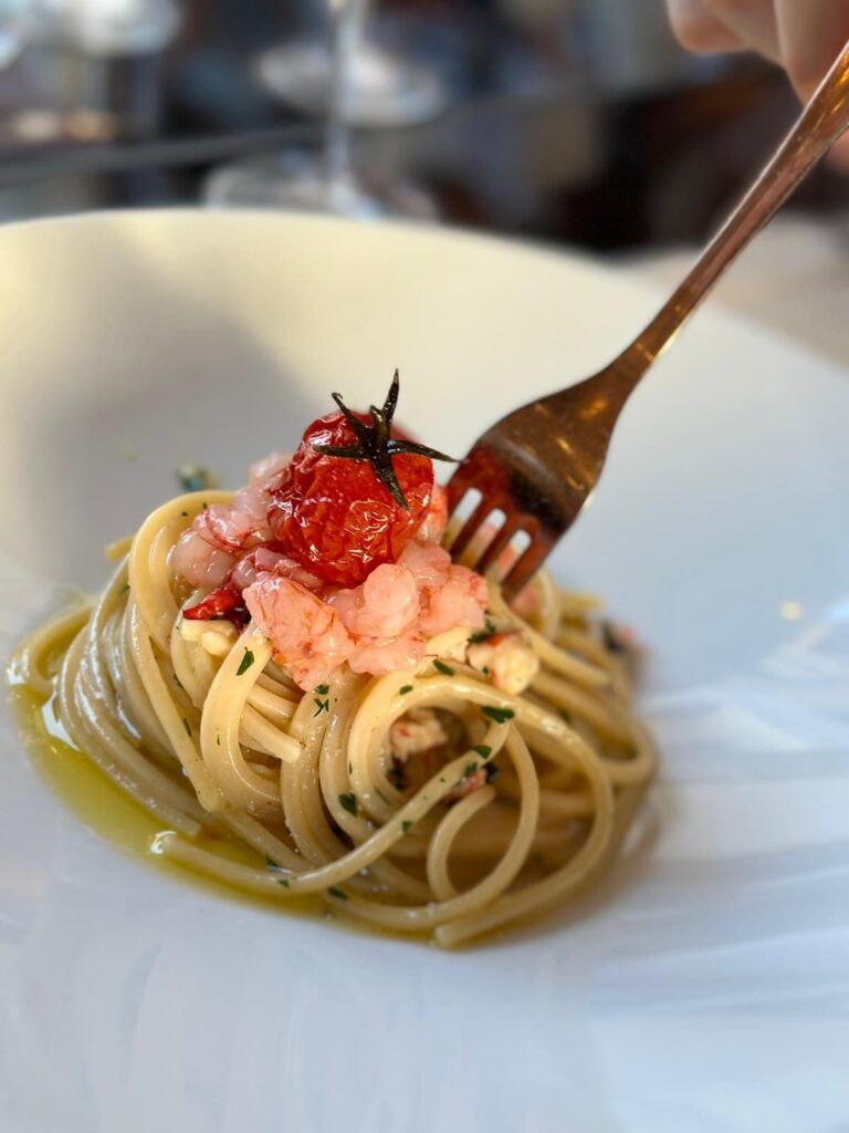 Nascono così imperdibili abbinamenti: Pasta aglio e olio con crudo di gamberi di Mazara del Vallo abbinato al Lecinaro Rosato “Fra diaure” (Lazio – Palazzo Tronconi); Panzanella con stracciata e pomodorini con Grechetto (Umbria – Palazzone); Fiore di zucca gratinato ripieno di ricotta mantecata al limone con Perle d’uva sboccato 2021 (Friuli Venezia Giulia – Gaspare Buscemi). Si va sui grandi classici per i dolci, messi a punto dal Sous Chef Matteo Rizzo: cannolo scomposto e crema catalana, per citarne alcuni.