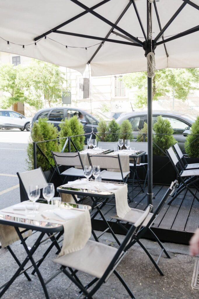 I tavoli in legno, senza tovagliato, sono arricchiti poi da posate ramate e poltroncine in pelle. All’esterno, un delizioso dehors su pedana offre circa 25 coperti. Tavoli in vetro e sedute in stoffa, ombrelloni e piante creano un angolo di tranquillità dove poter godere di un buon vino e della cucina di Enoteca Verso. Si definisce una “vino-osteria” per il suo connubio perfetto tra vini di ricerca e una cucina italiana, stagionale e di mercato, con un’attenzione particolare ai prodotti di qualità.