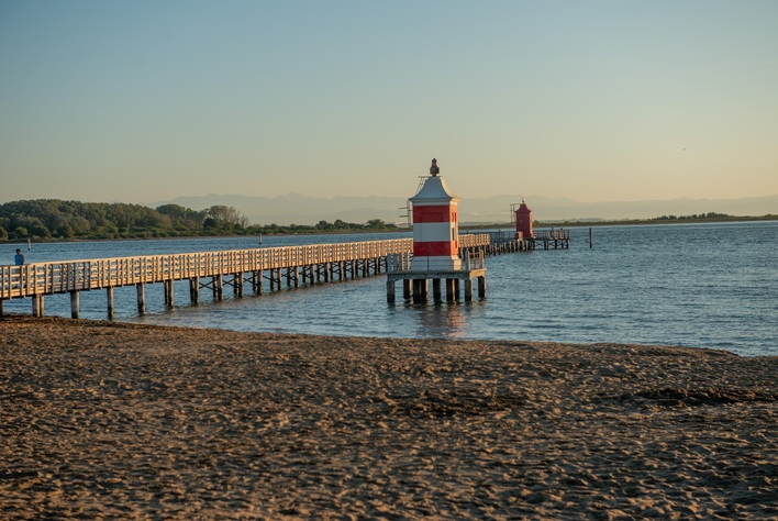 Per chi invece ama i colori e le sfumature che solo il tramonto sa regalare, soprattutto in questa stagione, il cammino più suggestivo è Nei Colori del Tramonto. Si parte dalla Darsena “Porto Vecchio” per poi seguire l’argine della laguna, regno indiscusso di cigni, anatre, germani e dell’airone cinerino. In questo cammino ci si può rigenerare e godere dei panorami tipici di questo luogo, scorgendo in lontananza le sagome di qualche Casone, le antiche dimore dei pescatori, che rendono ancora più incantevole il momento che precede il calare della sera. Il colpo d’occhio arriva fino ai monti del Friuli Venezia Giulia, che appaiono all’orizzonte come in un dipinto.