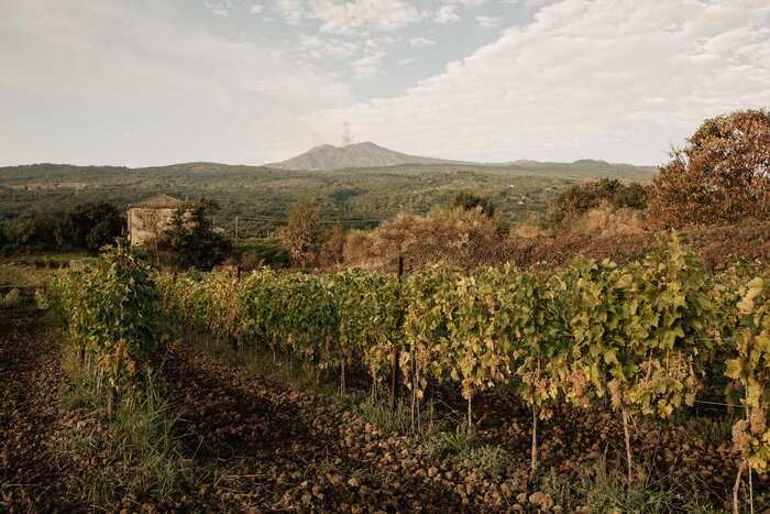 L’ultimo nato Cusumano, prodotto in appena 3.899 bottiglie, vede la luce in un territorio a 610 metri d’altezza, in suolo antico, ricco di sostanza organica, fatto di sabbie vulcaniche e pietre laviche risalenti a una colata del 1180, dove incontra da un lato l’aria di montagna dell’Etna e dall’altro la brezza del mare che proviene da Taormina. Le forti escursioni termiche tra giorno e notte favoriscono così una maturazione lenta, che preserva freschezza e sapidità. L’affinazione avviene poi in una cantina progettata secondo la moderna architettura ipogea, termoregolata dalla roccia lavica e al riparo dalla luce e sbalzi termici.